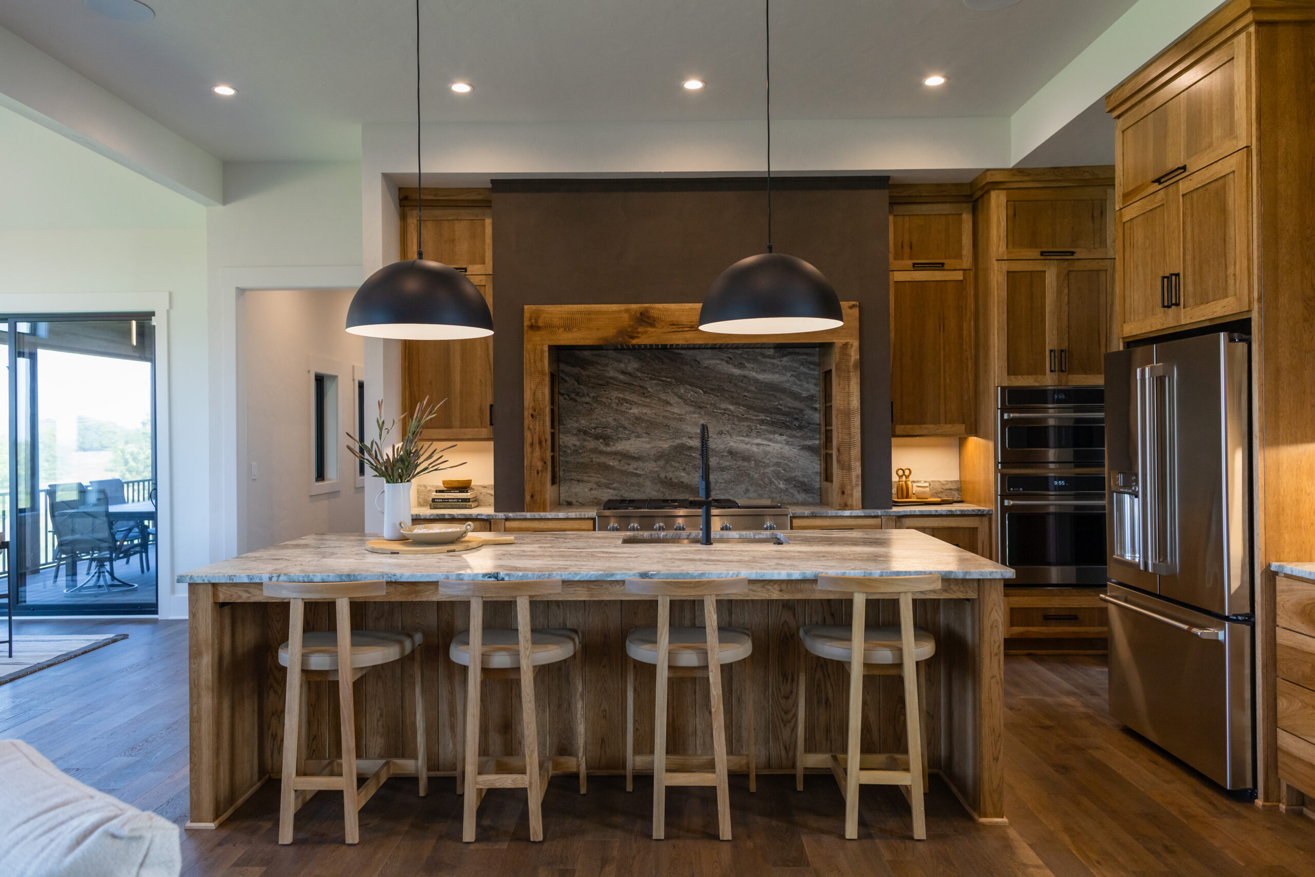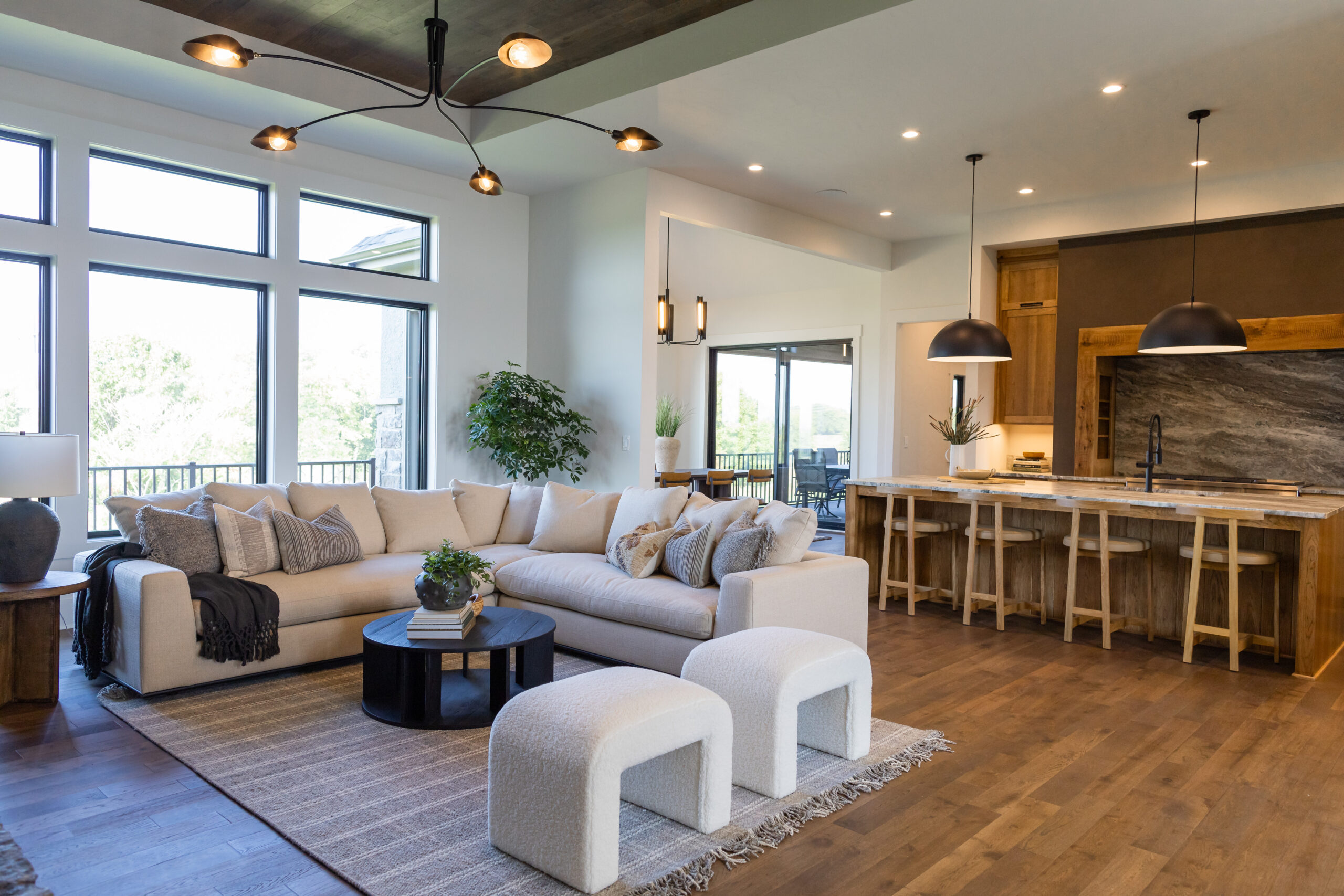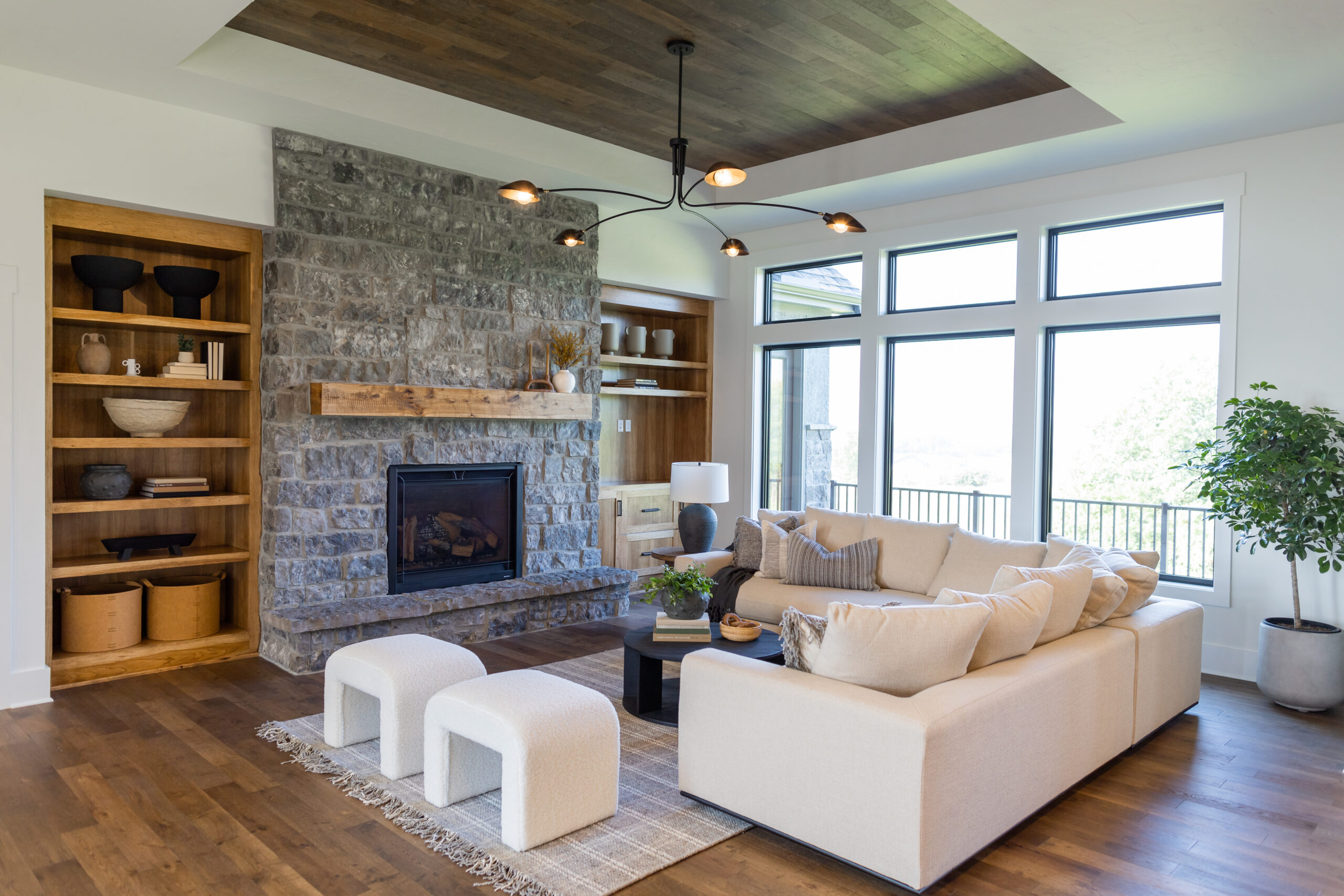 Welcome to Owen Homes’ award-winning plan, The Rainier, which overlooks the Shoal Creek golf course in the highly desired Eagle Pointe subdivision and Liberty School District. This reverse ranch with second-story bonus room features a Modern Mountain design that brings together natural wood and stone elements throughout. With 5,085 square feet of finished space, this home offers 5 bedroom suites, each bedroom with its own bathroom and walk-in closet. There are also 2 laundry rooms and 2 powder baths conveniently located on the main and lower levels.